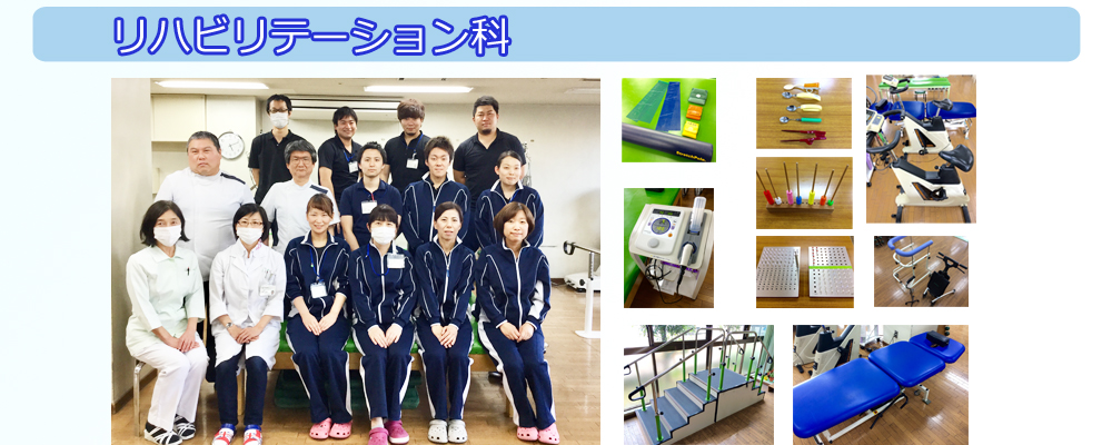 当科には理学療法士8名、作業療法士4名、言語聴覚士1名、マッサージ師2名、受付1名が在籍し、脳血管Ⅰ・運動器Ⅰ・呼吸器Ⅱの施設基準を設けてリハビリテーションを提供しています。